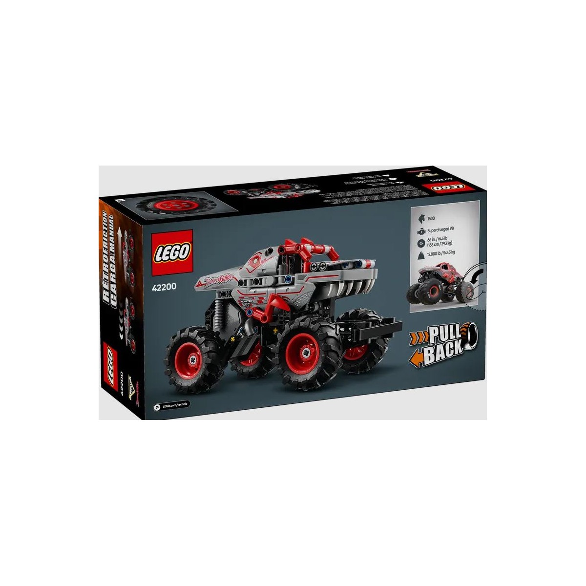 Ti presentiamo un camion pull-back per entusiasmare i fan di Monster Jam™ dai 7 anni in su. Questo truck giocattolo Pull-back ThunderROARus™ Monster Jam LEGO Technic per i bambini e le bambine include una divertente funzione pull-back. I bambini possono ricreare l’emozione dell’arena lanciando il loro truck dinosauro giocattolo a tutta velocità e ricreando le acrobazie ad azione rapida dei loro monster truck preferiti.