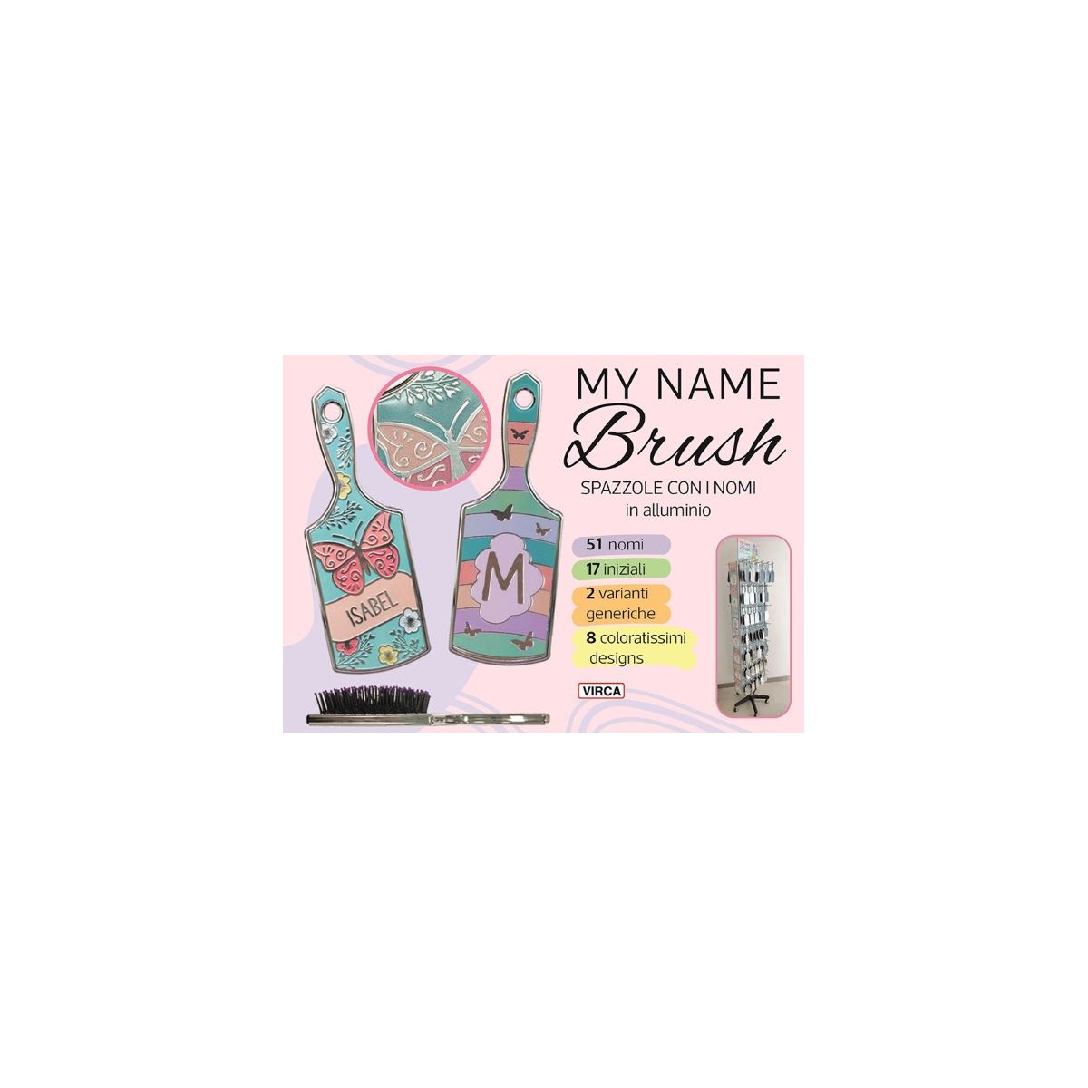 Spazzole in alluminio con i nomi. 51 nomi, 17 iniziali, 2 varianti generiche, 8 coloratissime grafiche.