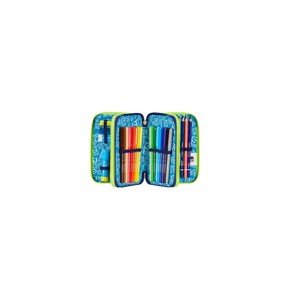 Ciao! Sono il coloratissimo Astuccio 3 zip SJ Gang. Dotato di 3 scomparti completi di tutto il materiale necessario per fare al meglio i tuoi lavori di scuola, puoi abbinarmi a uno zaino o a un trolley SJ Gang.