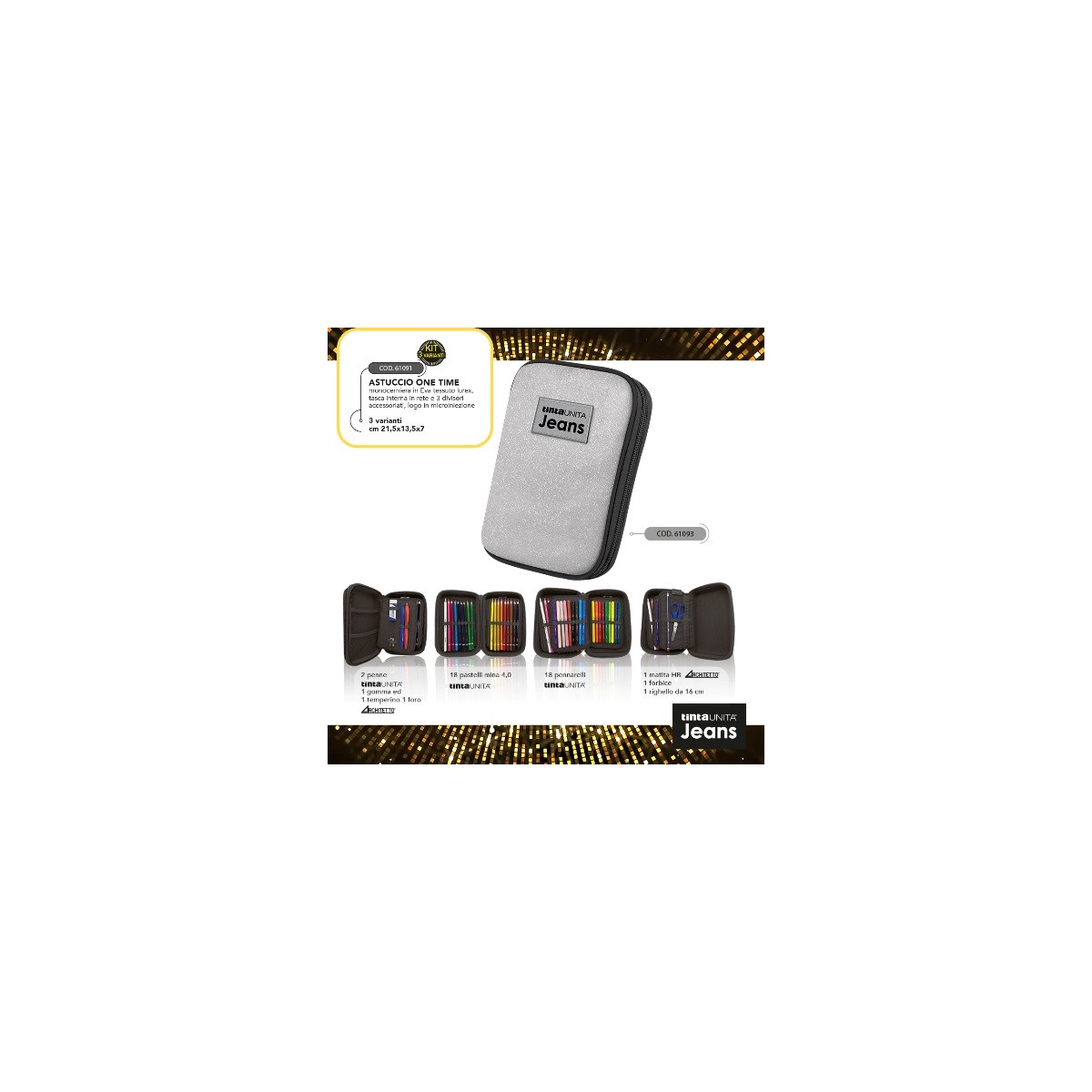 Contiene: 2 penne, 1 gomma, 1 temperamatite, 18 pastelli tinta unita, 18 pennarelli tinta unita.