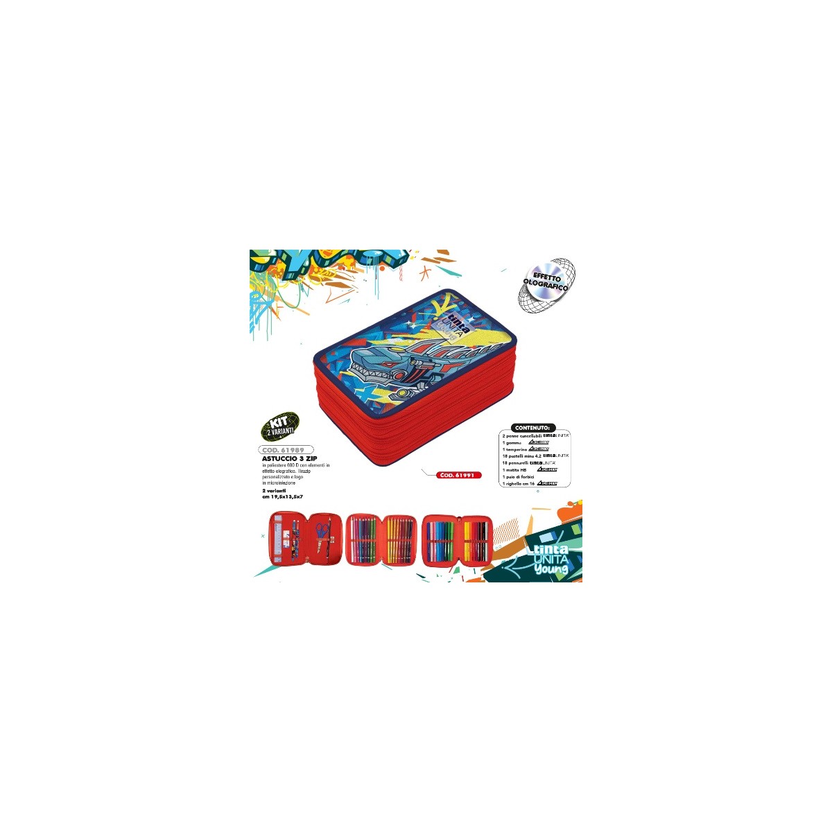 Astuccio in poliestere con elementi in effetto olografico. Tirazip personalizzato e logo in microiniezione.