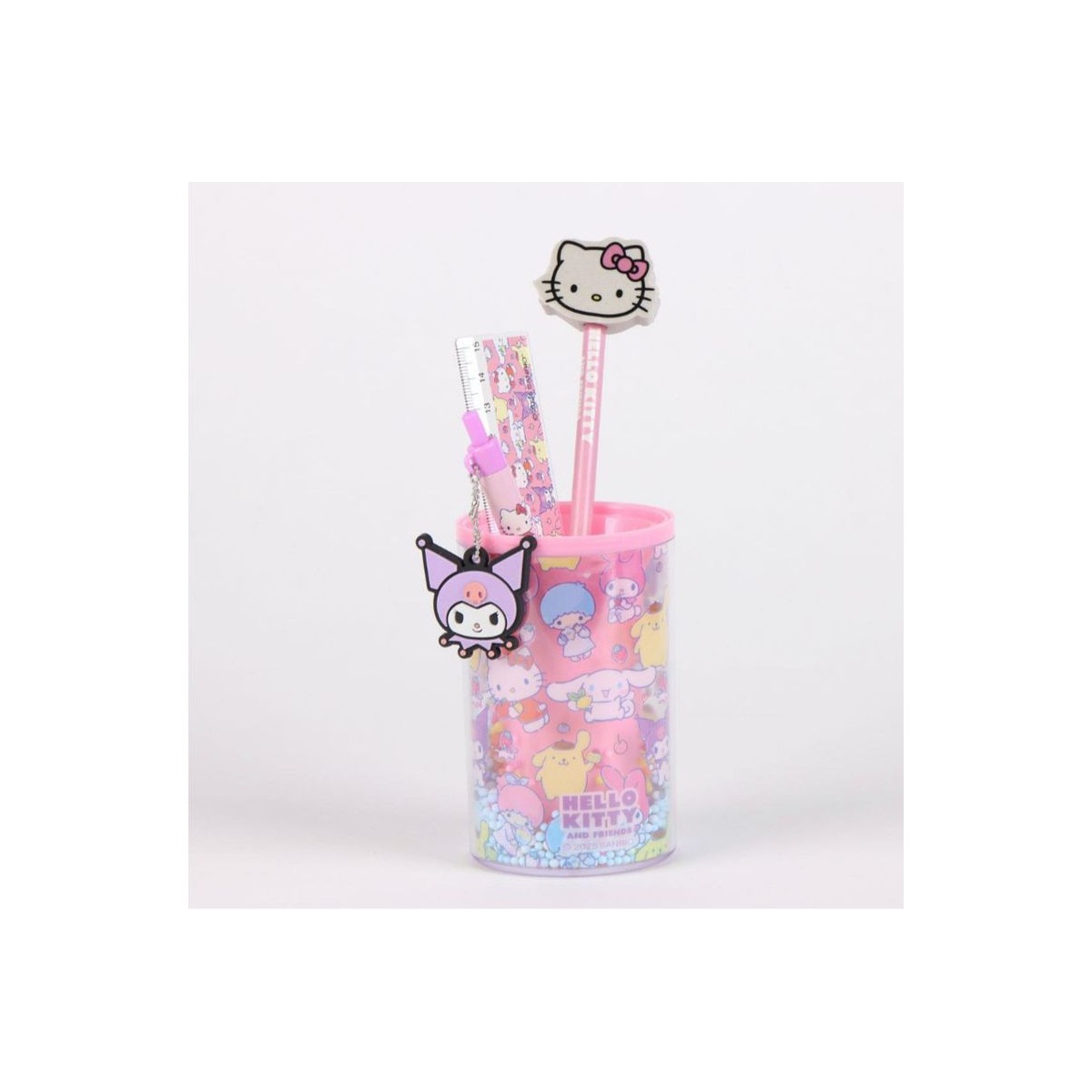 Contiene: 1 portapenne, 1 penna con ciondolo, 1 matita con gomma, 1 righello 15cm