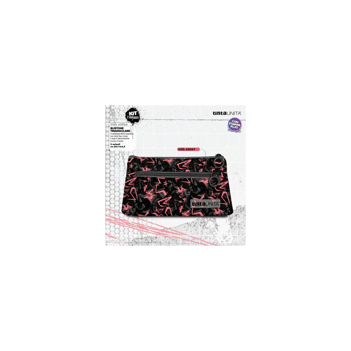 Busta con doppia zip in poliestere stampato, con colori fluo, tirazip e logo in microiniezione.