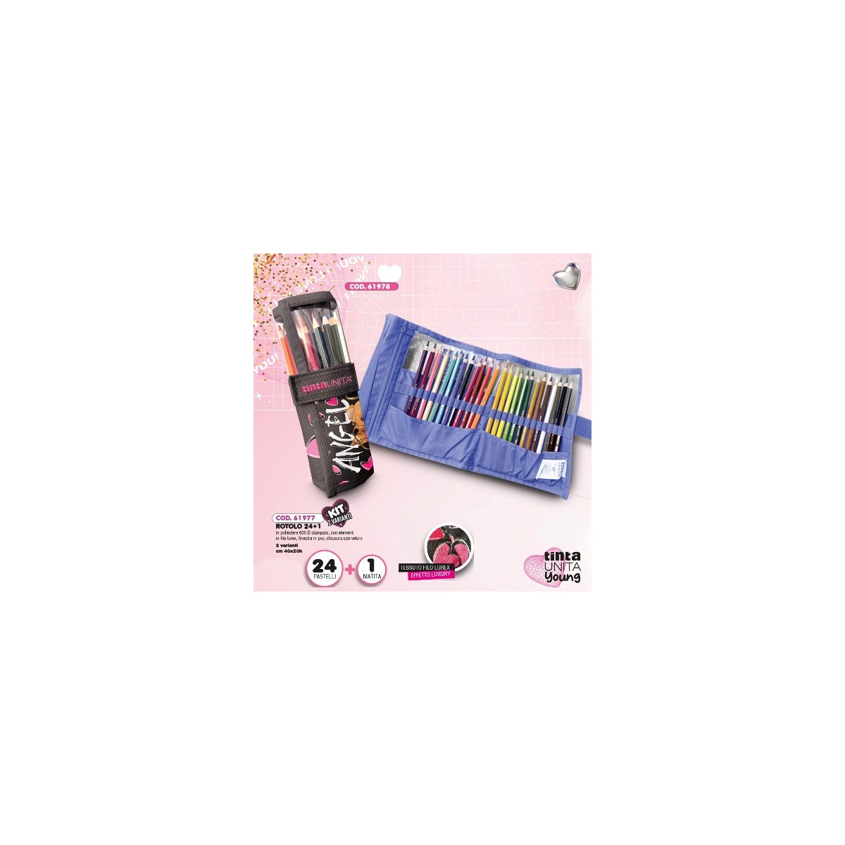 Rotolo Tinta Unita Young 24 Pastelli + 1 Matita Angel Orso con Cuori